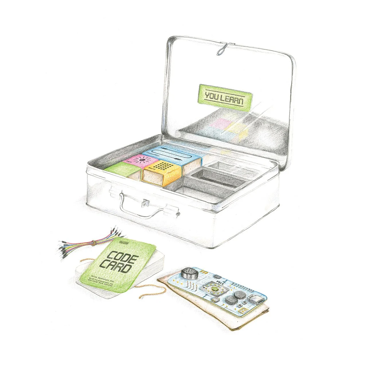 Decentralizing Digital, Children’s Coding Kit. Stainless steel case containing ‘Your Voice’ developers board, various electronic components, and a deck of coding cards. 2025.