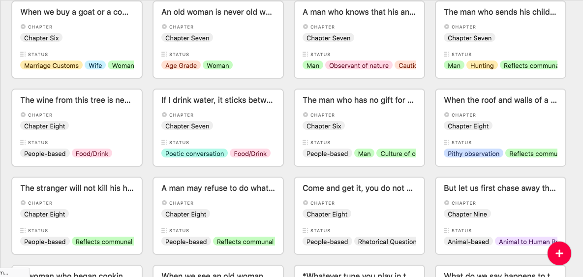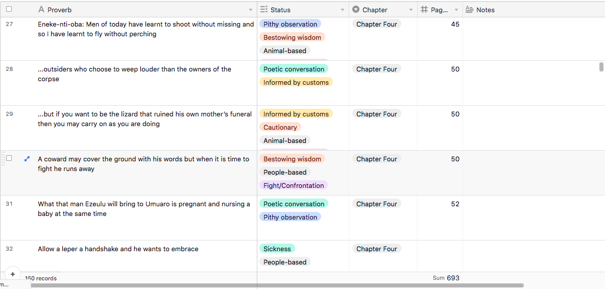 Screenshot of our corpus of proverbs from Arrow of God as well our attempts to categorise and sort them.