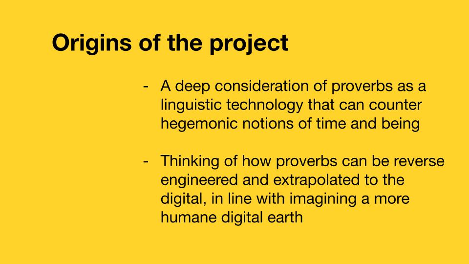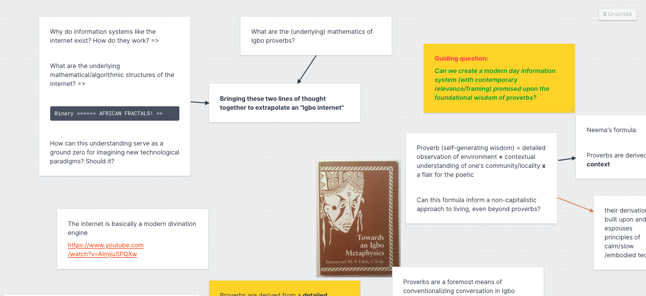 This story reminds me of Uzoma and Sheila’s Digital Earth fellowship studio crit sessions in which several of the faculty and student body wrestled with their “translation” of proverbs (in Igbo and English) into a visual medium (still, printed, animated, moving image visual content). At one point, a faculty member suggested “Siri” as a model for proverb translation. Thinking back to that crit session now, I reflect on it differently because of my belief that the “front end” and “back end” dichotomy is false. What might it mean for Proverbial Protocols to remain distinctly a work of language such as oral, written, or programmed language? What might it mean to think of Uzoma and Sheila’s work as a work of code? To borrow Uzoma’s question, what might it mean to have Chinua Achebe’s internet? Contrary to this, our current fascination with “front end” and CGI technologies obscures the reality of “back end” tech, such that when software engineers at Facebook and Google begin protesting, we rarely understand how much their work impacts the Feed or the Timeline. What I might imagine for a Proverbial Protocol is that front and back end processes could be equally considered, such that working with “back end” programmers through protocols of language and proverbs, such as developing code flow-charts to illustrate various language protocols found in the novels of Chinua Achebe could be just as exciting as developing complex graphic and visual interfaces.