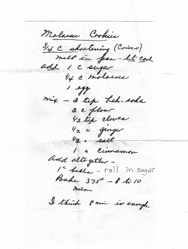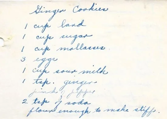 These recipes are submissions the artist received in response to her project Cookie Calls, which she conceived of and developed during her 2020-21 Digital Earth Fellowship. These hand-written recipes, Molasses Cookies and Ginger Cookies were submitted by OO and MO.